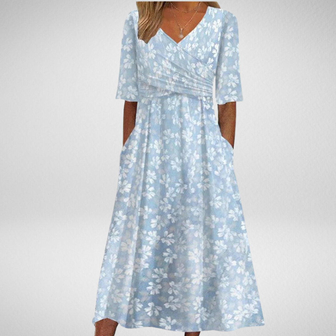 Stap stijlvol de zomer in met de Camille-jurk. Met een flatterende V-hals, zachte bloemenprint en een ademende mix van spandex en rayon is deze midijurk perfect voor zonnige dagen en ontspannen momenten. De korte mouwen en onzichtbare zijzakken bieden een combinatie van comfort, functionaliteit en tijdloze elegantie.