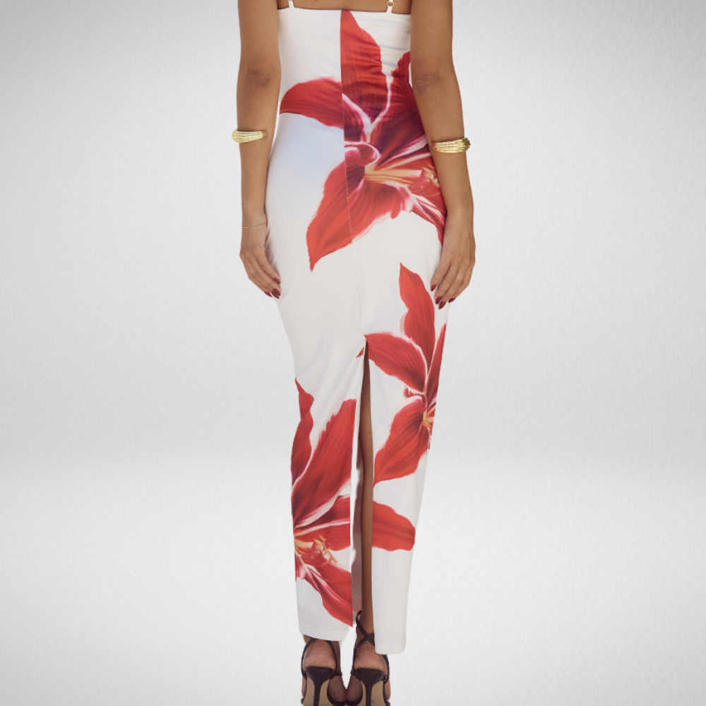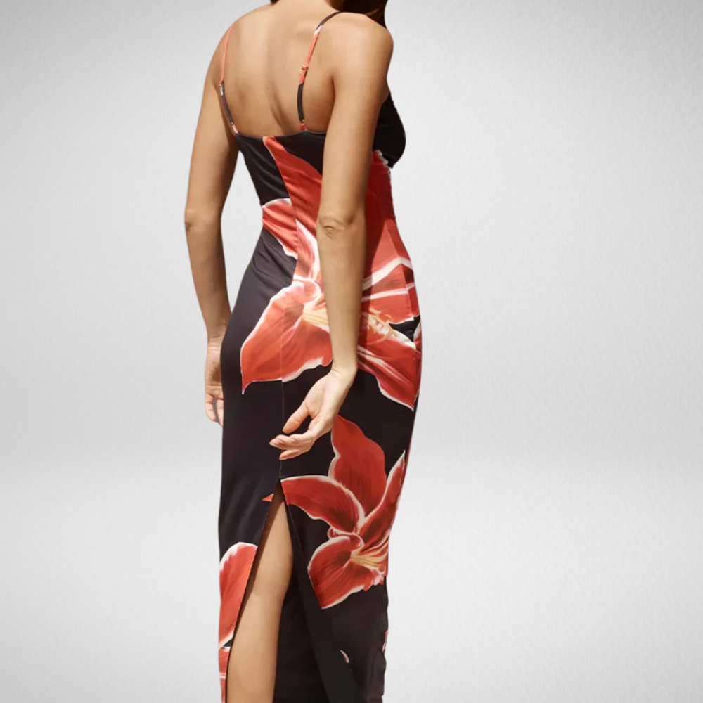 Deze prachtige midi-jurk met een betoverende bloemenprint is perfect voor elke gelegenheid, van casual uitstapjes tot formele evenementen.