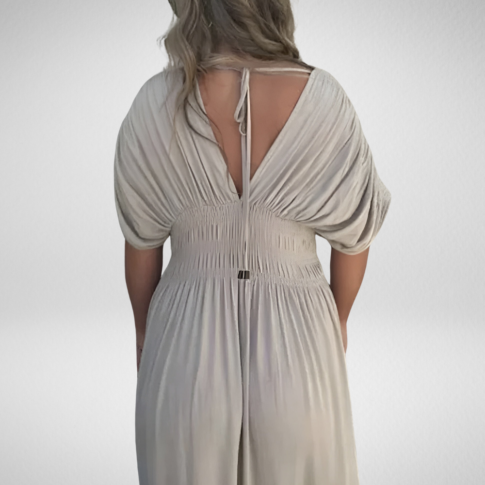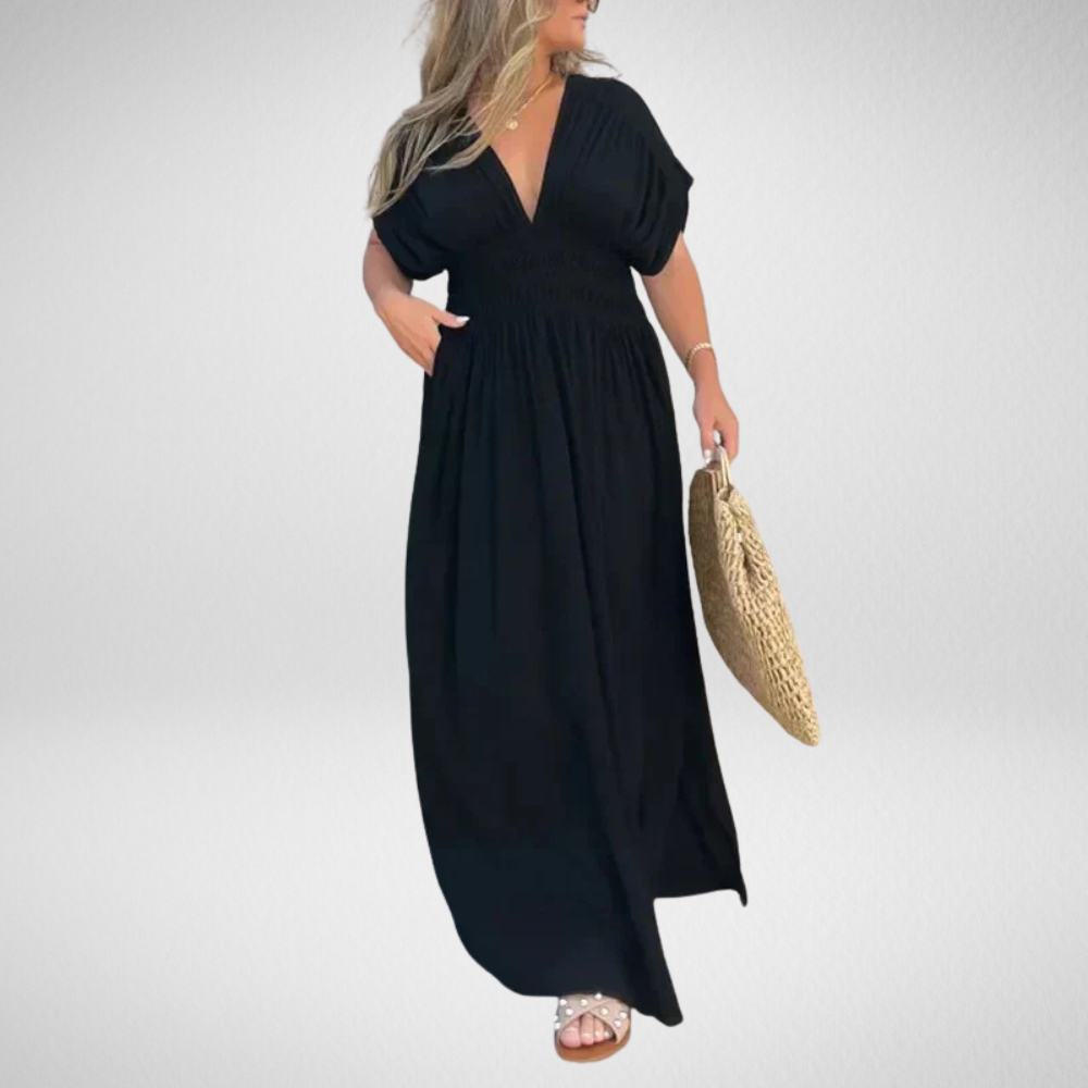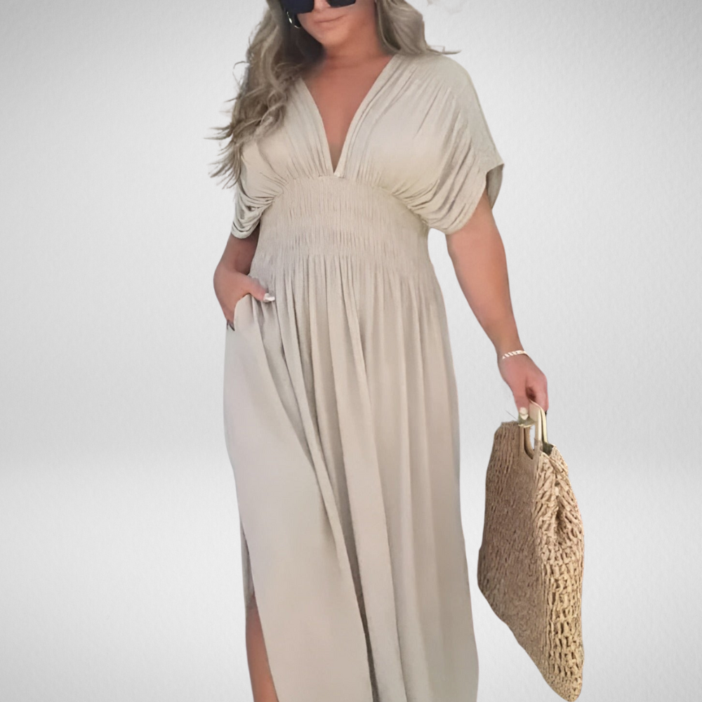 Deze verfijnde maxi-jurk met een diepe V-hals en stijlvolle split is perfect voor zowel formele als informele gelegenheden, en voegt een vleugje tijdloze klasse toe aan je garderobe.