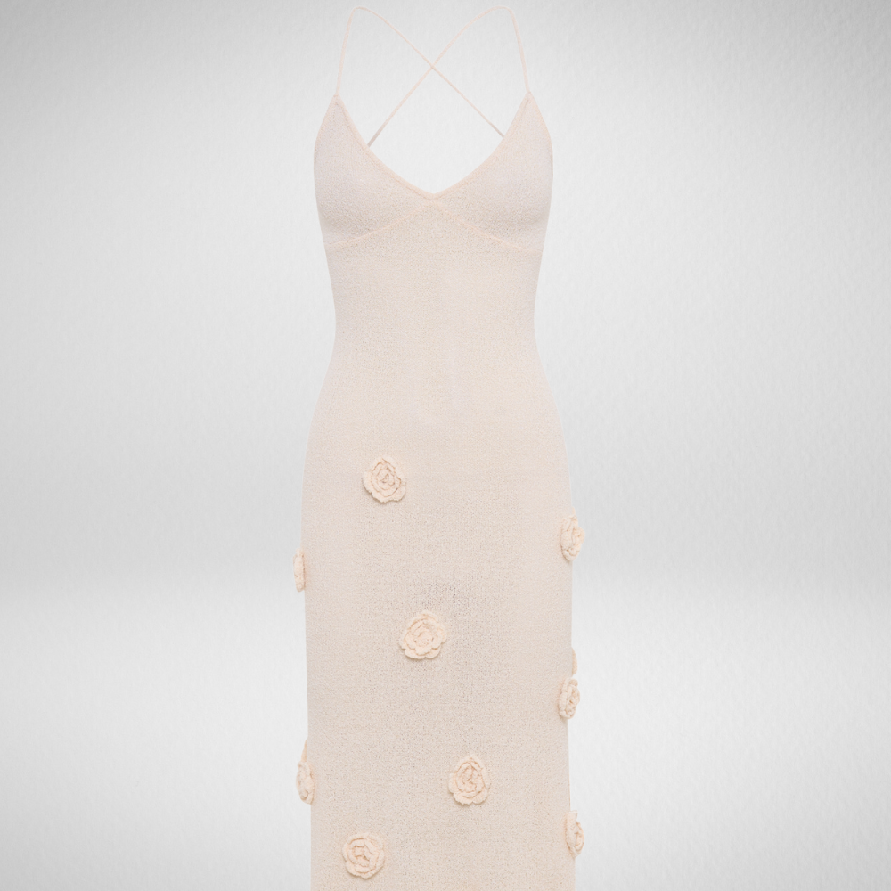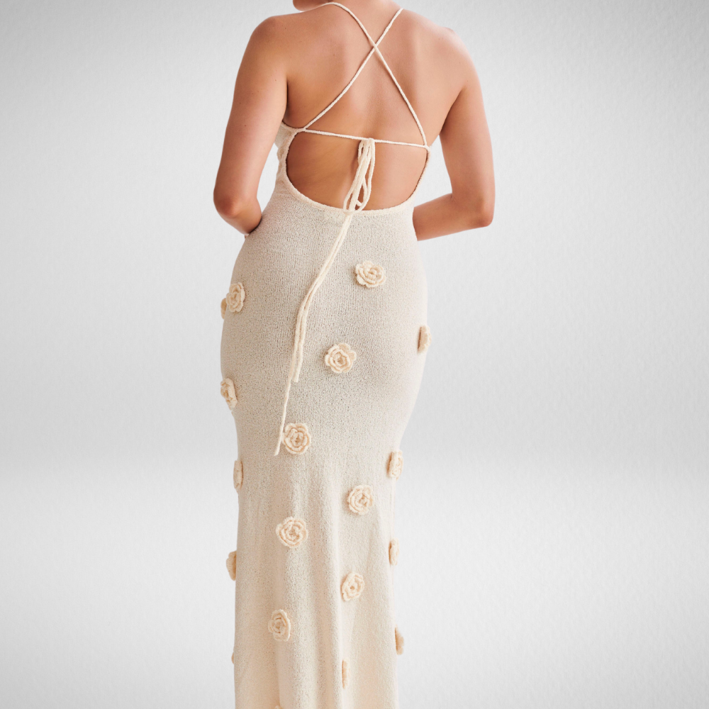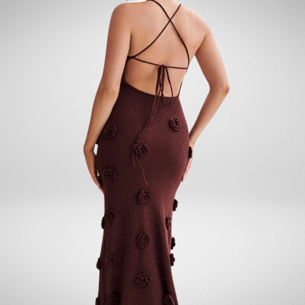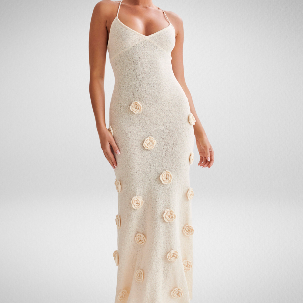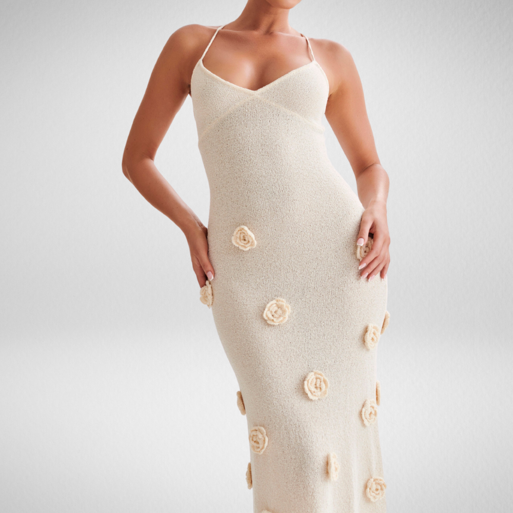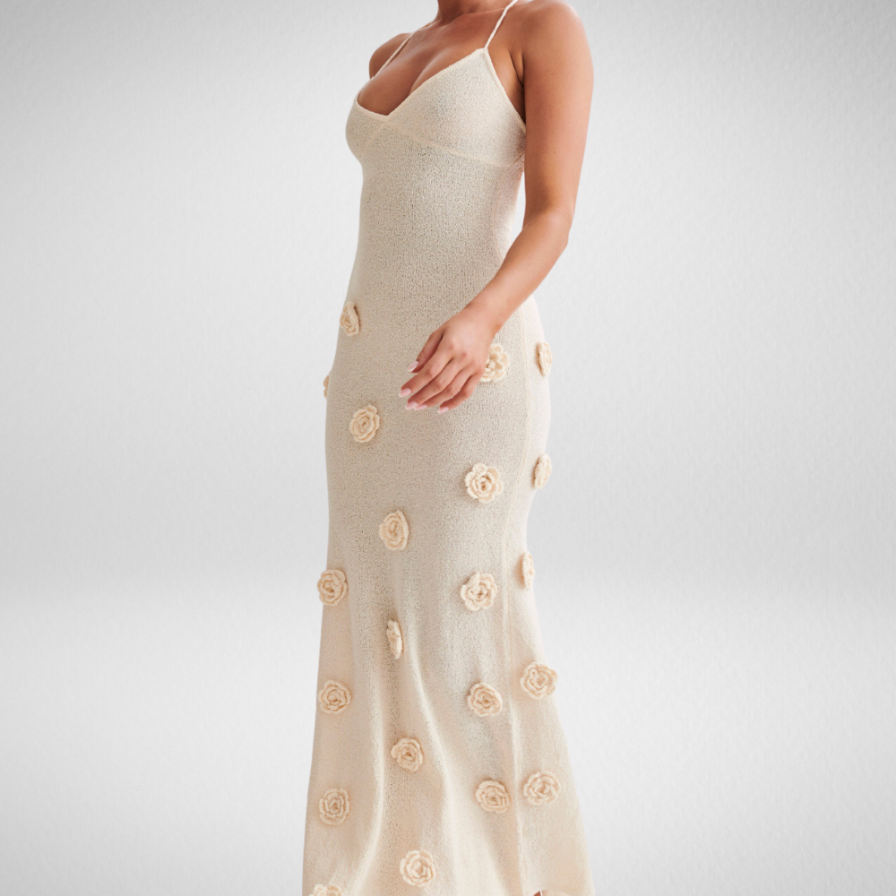 Deze elegante gebreide maxi-jurk met bloemenaccenten is perfect voor zowel casual als formele gelegenheden en voegt een vleugje verfijning toe aan je garderobe.