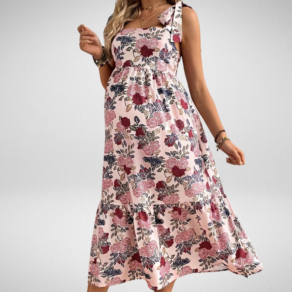 De soepel vallende stof beweegt als een briesje met je mee – licht, ademend en liefdevol rondom je buik. De romantische bloemenprint in zachte tinten laat je opvallen zonder te overheersen, en de subtiele ruches op de schouders geven je precies dat beetje extra vrouwelijkheid waar je zo naar verlangt.