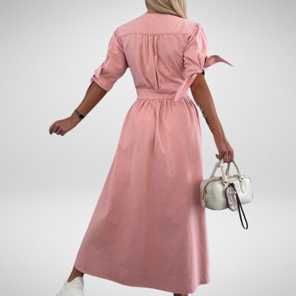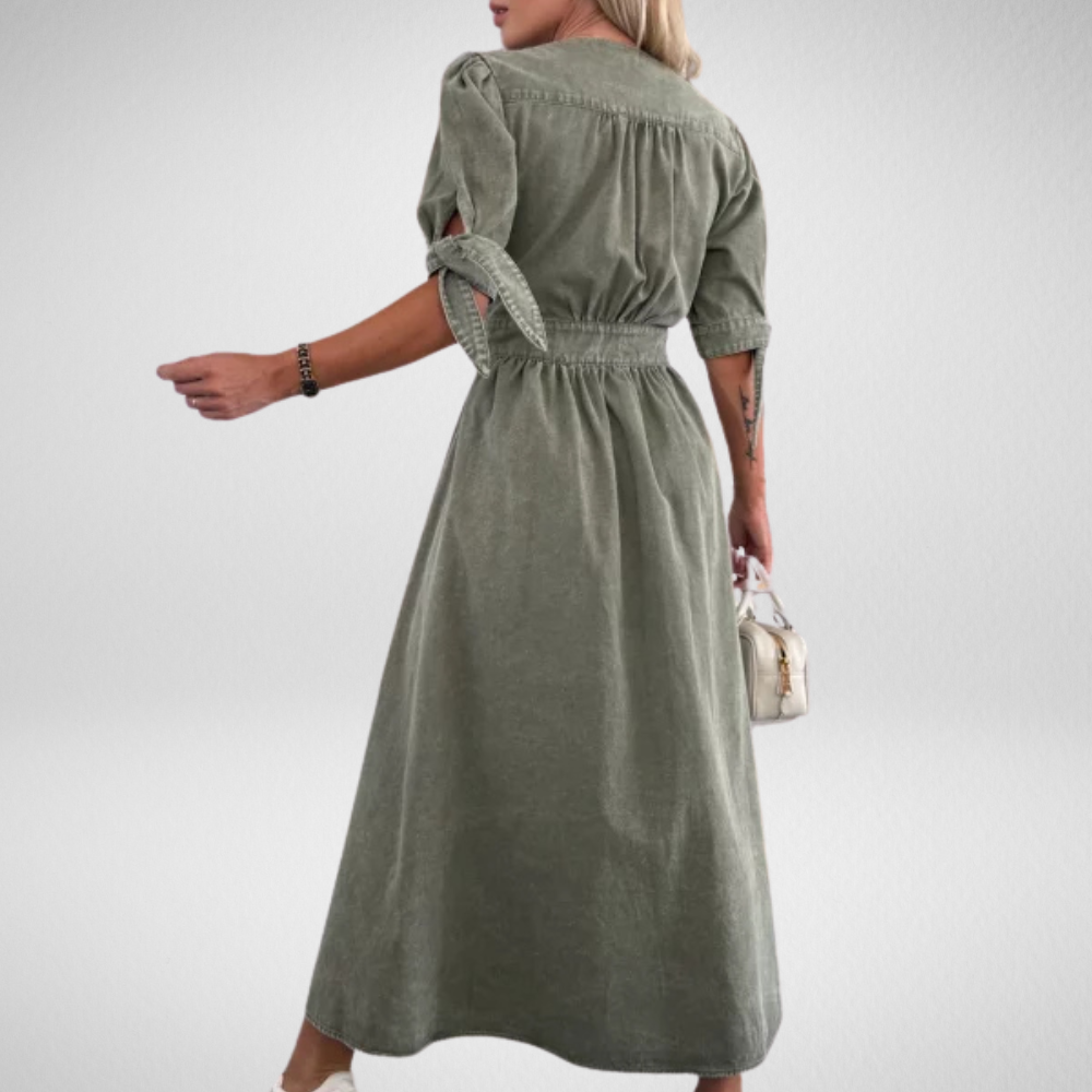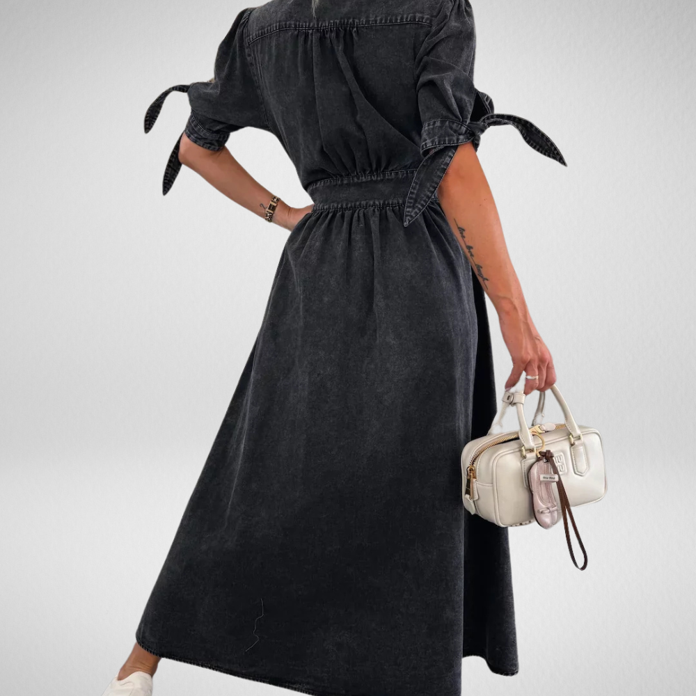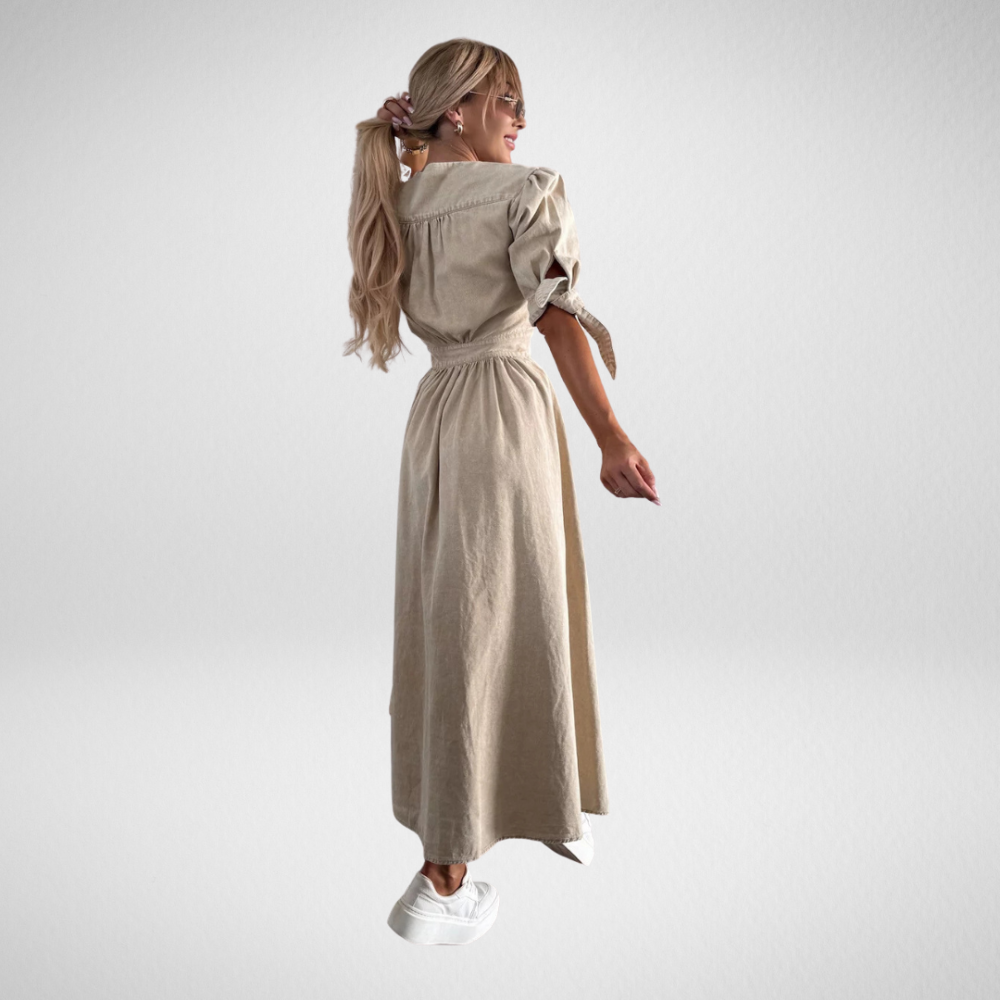 Heb je ook zin om je van je mooiste kant te laten zien? Die momenten waarop je je geweldig voelt en het ene compliment na het andere ontvangt. Dit elegante jurk doet precies dat voor jou! Met de houten knopen en stijlvolle strikjes op de mouwen trek je gegarandeerd alle aandacht.