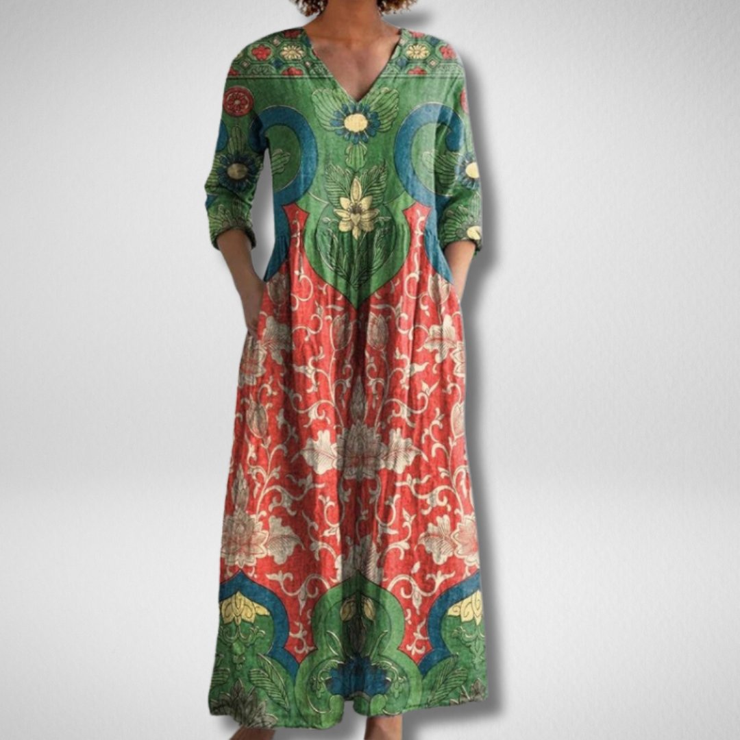 De Judith-jurk brengt vintage charme naar je dagelijkse garderobe met een verfijnde bloemenprint en een zwierige pasvorm. Gemaakt van ademend katoen, met een flatterende V-halslijn en elegante lange mouwen die een vleugje verfijning toevoegen. De enkellange lengte maakt deze jurk perfect voor zonnige wandelingen, weekendtripjes of moeiteloos stijlvolle momenten – het hele jaar door.