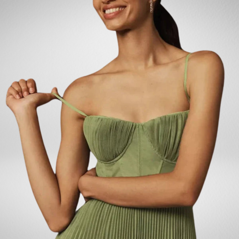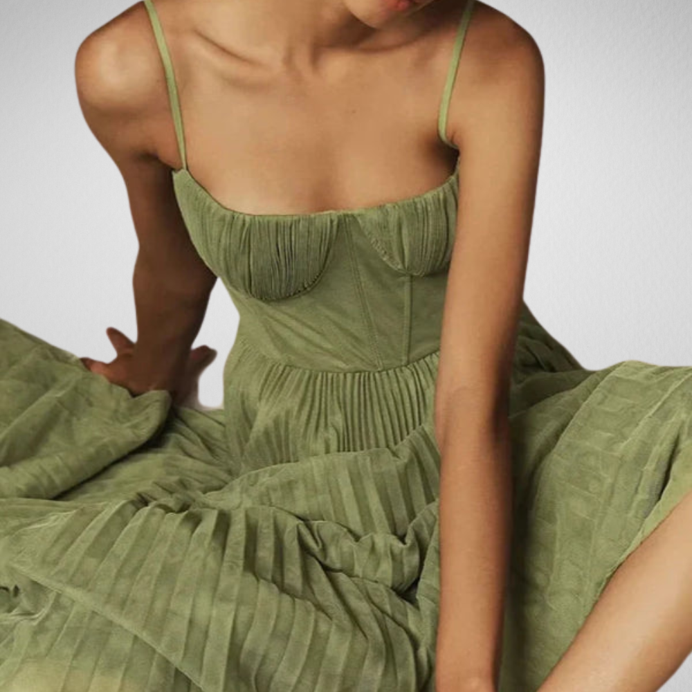 Met haar luchtige lagen, verfijnde bustier-top en sierlijke beweging is Liora Bloom alles wat je zoekt in een jurk: vrouwelijk, comfortabel én adembenemend mooi.