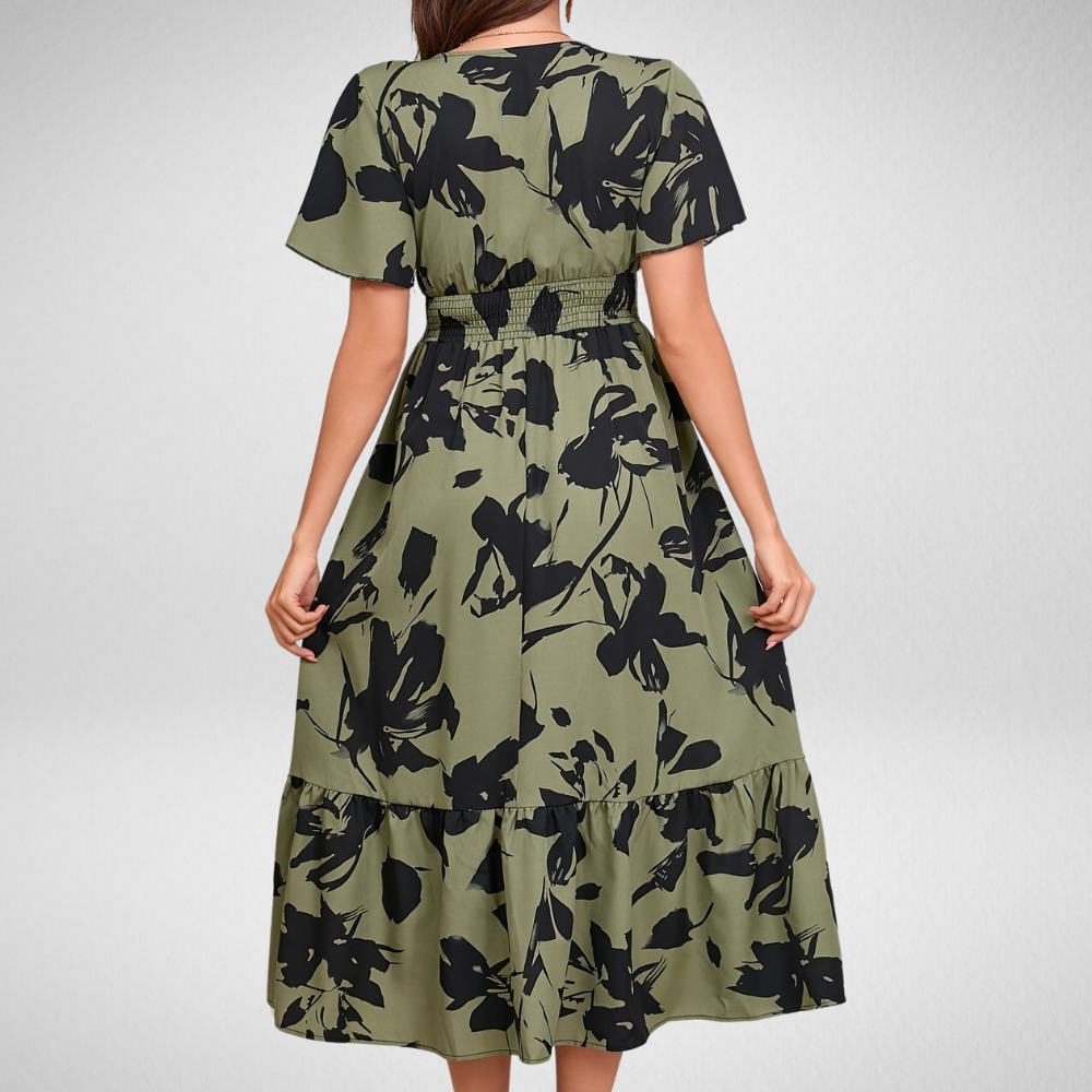 De elegante V-hals opent subtiel je halslijn, terwijl de zwierige fluttermouwen je bovenarmen zacht omhullen. Niets knelt. Alles stroomt.
