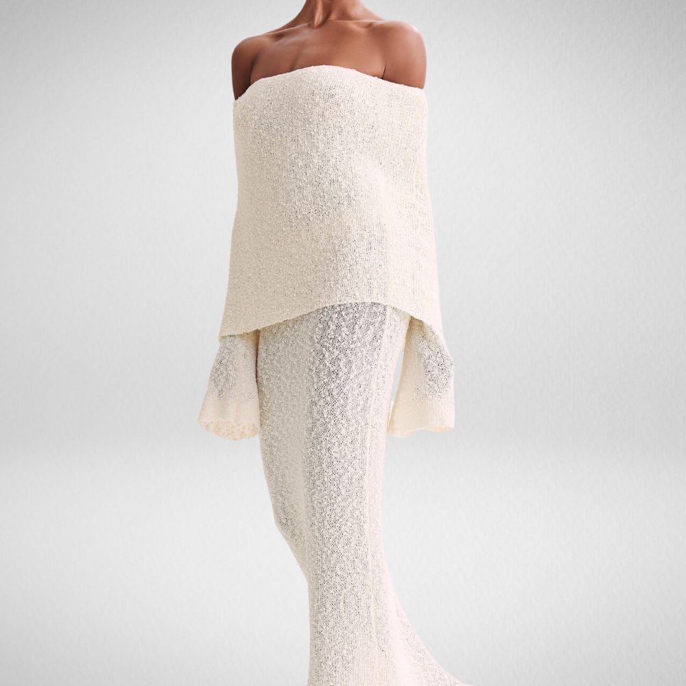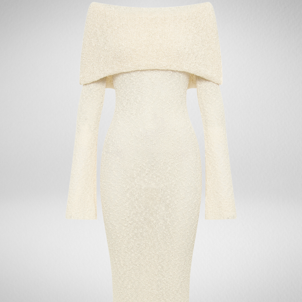 Straal elegantie uit met de Marisol Off-Shoulder Jurk in Ivoor!