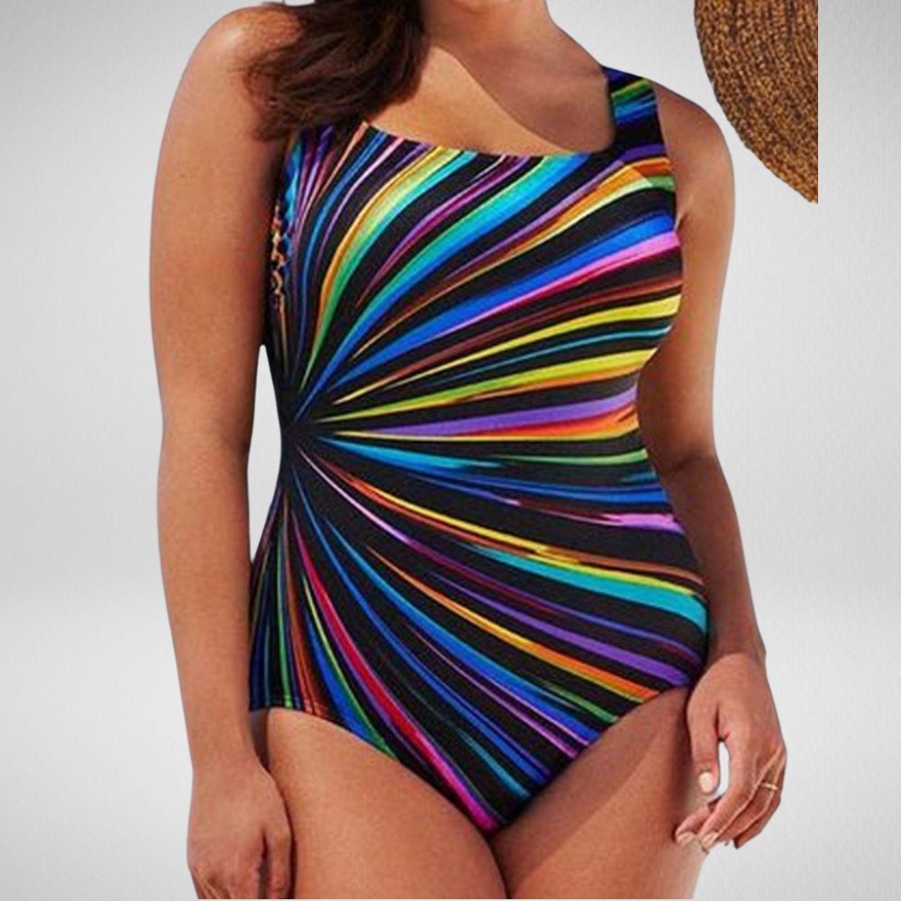 Rita is een stijlvol eendelig badpak met een levendig patroon van kleurrijke strepen. Perfect voor jou, die wat kleur en vreugde aan je strandgarderobe wil toevoegen – ideaal voor warme zomerdagen aan het strand of bij het zwembad.